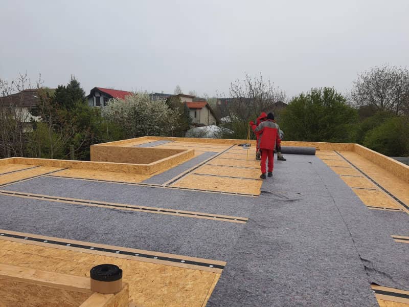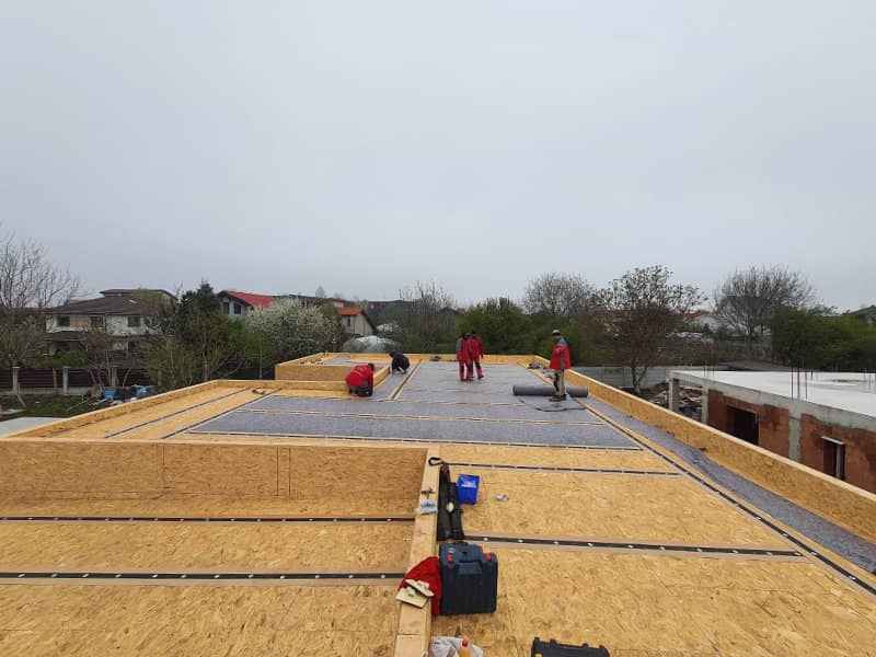 • Aplicare membrana EPDM Firestone, un material cu elasticitate superioara, adaptat perfect pentru cladiri din lemn si acoperisuri necirculabile.