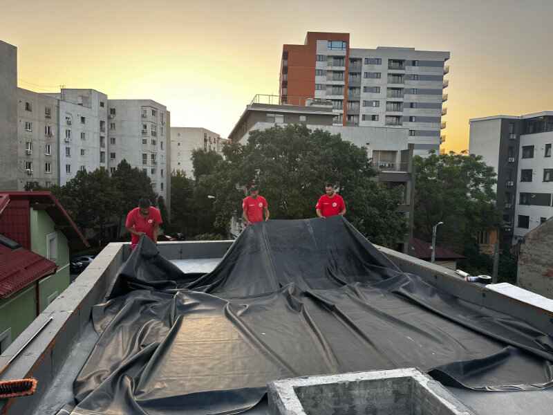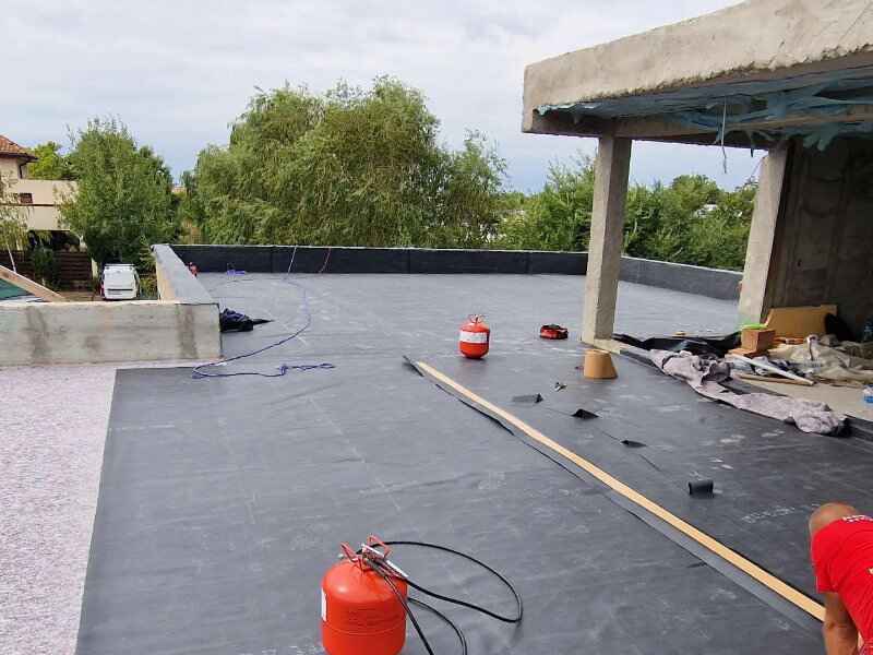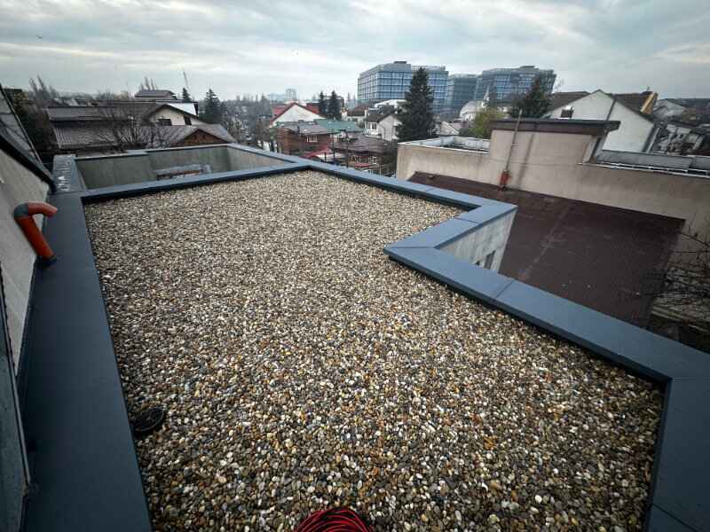 - Hidroizolatie cu membrana EPDM (Firestone), instalata in sistem lestat, solutie ideala pentru acoperisuri plane, care elimina necesitatea ancorarilor mecanice si asigura flexibilitate si rezistenta la raze UV, intemperii si variatii de temperatura.